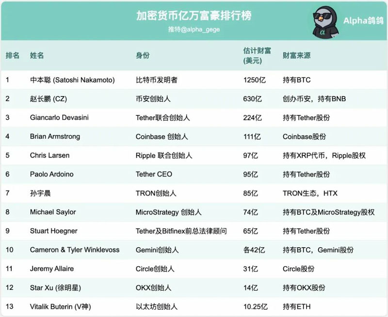 目录 01 币圈知名富豪一览 1. 中本聪 2. 赵长鹏 3. Giancarlo Devasini 4. Bri...