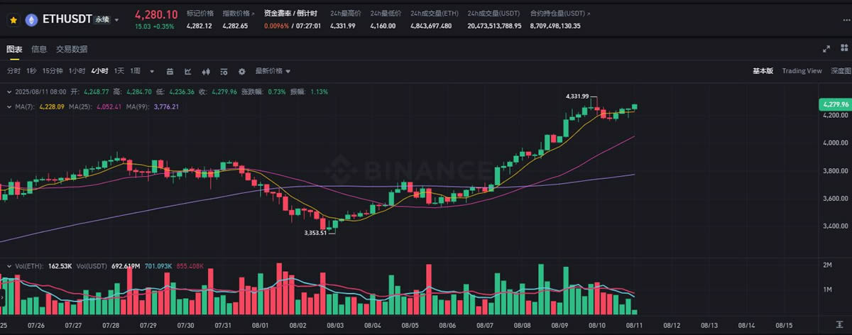 加密市场热浪翻涌,以太坊正引领本轮加速行情。 过去48 小时,ETH强势攻破4000 美元心理关口,最高触及4200 美元,现报4194 美元,创45...
