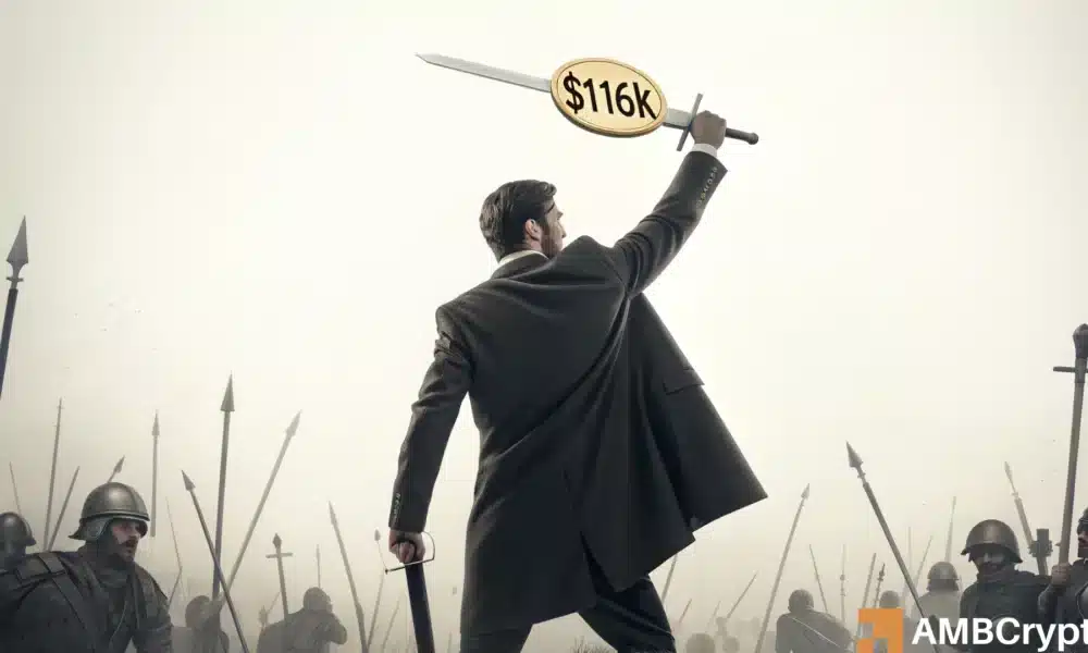 币界网报道: 关键要点 比特币面临 116,000 美元的战场,流动性堆积,STH 获利回吐,107,000 美元的支撑位面临风险,...