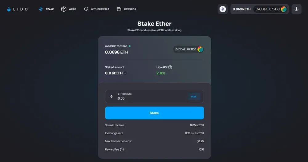 Lido被广泛认为是以太坊流动定投的标准,它提供了一种直接的 ETH 定投方式,同时又不放弃灵活性。它的核心吸引力在于 stETH,这是一种能反映 ETH 价值和累积奖励的代币,同时还能在数十种 DeFi 协议中使用。