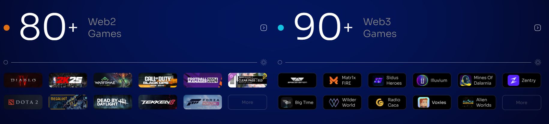 Balance 游戏去中心化应用程序提供对多种 Web2 和 Web3 游戏的访问。这些游戏包括超过 80 款 Web2 游戏,如《使命召唤:黑色行动 6》、《铁拳 8》、《足球经理 2024》等,以及 90 多款与 Balance 密切合作的 Web3 游戏,如 Matr1x Fire、Seraph、Mines of Dalarnia 和 Zentry。