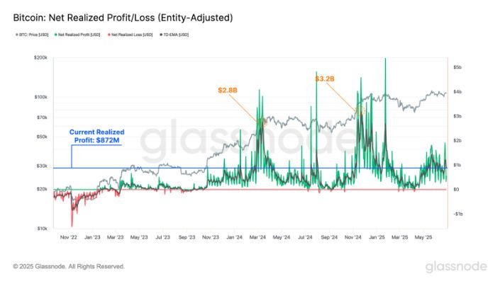 尽管价格走势积极,但近期实现的利润相对低迷。比特币当前价格距离历史高点仅一步之遥,但每日实现的利润仅为 8.72 亿美元。这与之前价格飙升至 73,000 美元和 107,000 美元时的 28 亿美元和 32 亿美元的实现利润形成鲜明对比。