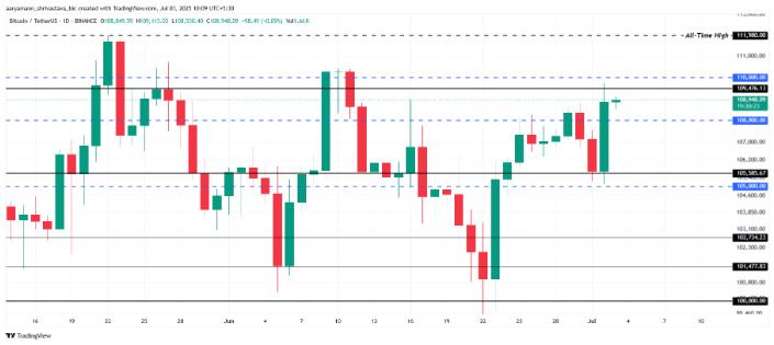 如果出现意外情况导致宏观经济看空信号,比特币可能面临潜在的回调。在 109,476 美元遭遇拒绝可能会将价格拉回到 108,000 美元以下,重新测试 105,585 美元的支撑位。这样的下跌将使当前的看涨前景失效,并可能预示比特币进入更长时间的盘整阶段。
