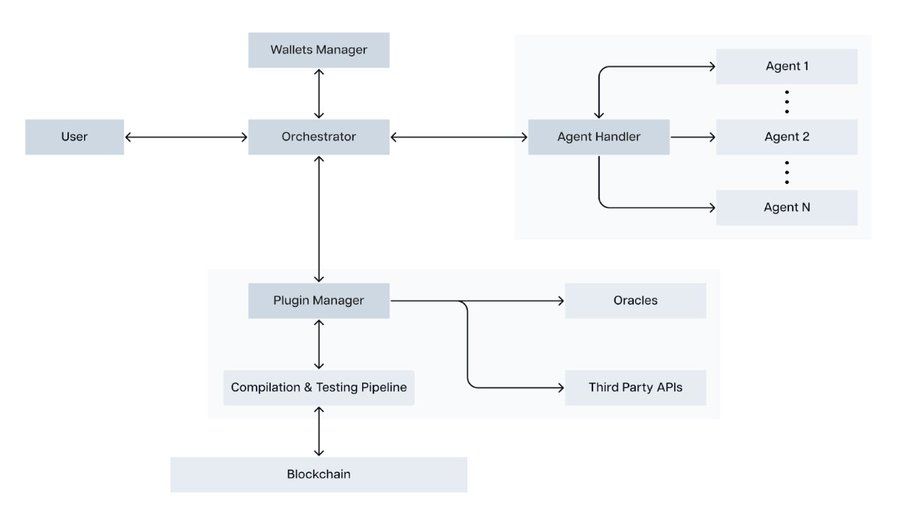 以下是Spectral Syntax网络的一般架构概述,其中包括一个协调器来管理通信、钱包处理和插件集成。从提示提交到代理动作的每个阶段都通过这个结构,允许代理基于实时数据执行任务。