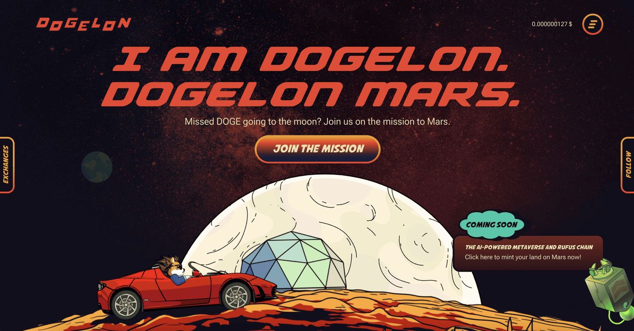Dogelon Mars 融合了迷因币领域中的多个热门主题,将Dogecoin 和Elon Musk 品牌与火星探索的愿景结合,这与SpaceX 的使命目标相契合。该项目的名称巧妙地融合了Dogecoin 和Elon Musk 的参照,同时暗示着Dogelon 将会向红色星球进行大规模的向上运动。除了它讽刺性的名称外,该项目已成功围绕太空探索主题建立了专注的社群,尽管它仅仅作为一种迷因币运行,并且没有真正的实用性,仅限于投机交易。