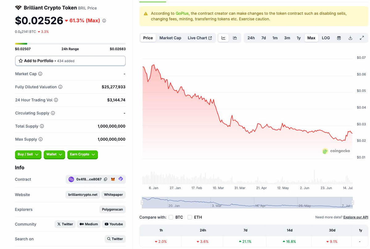 BRIL的价格表现自发布以来大幅下滑,六个月内从约$0.065降至约$0.025。目前日交易量较低,表明初始炒作后投机兴趣减弱。官方未披露流通供应量数据,限制了对完整市值的估计。