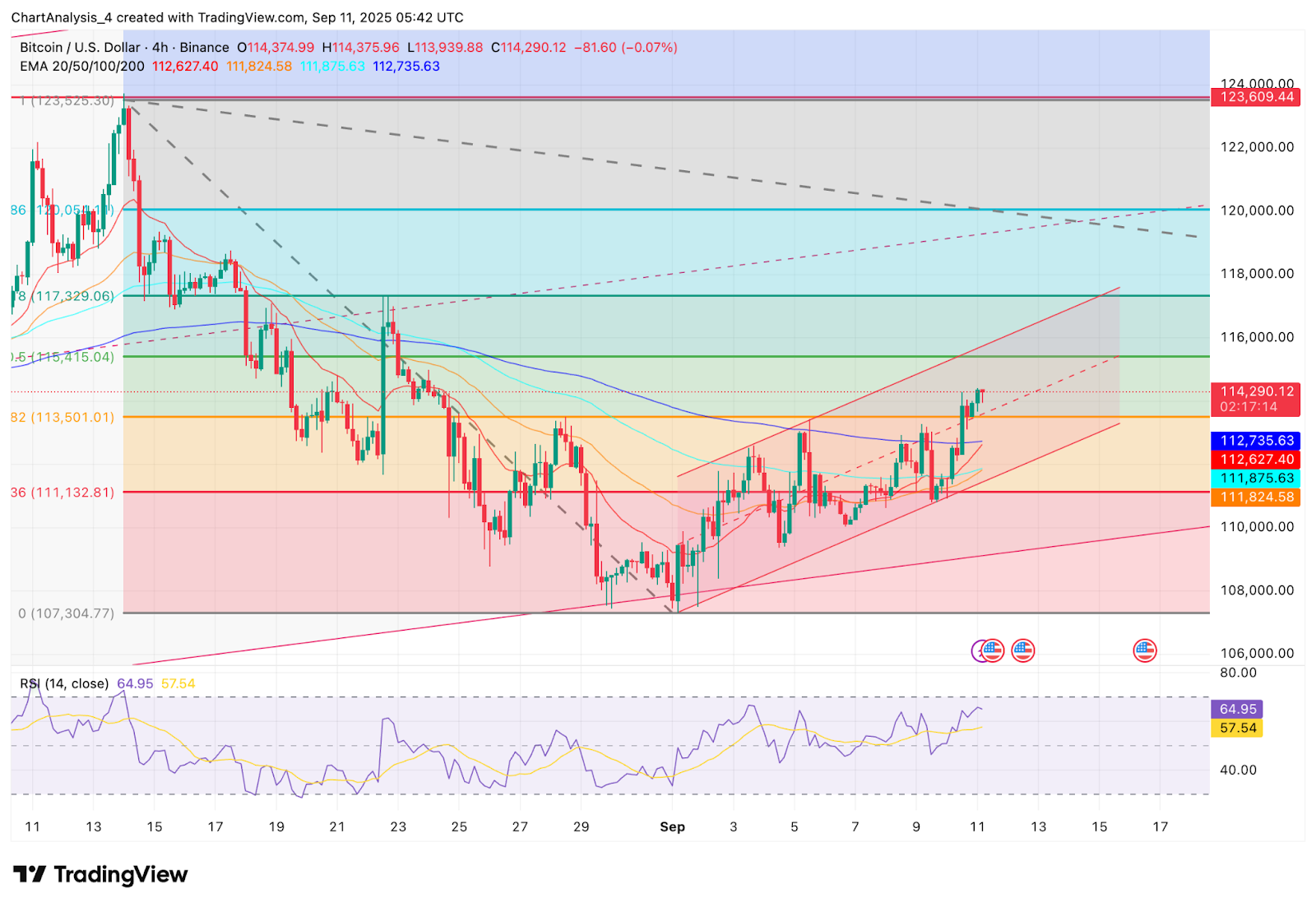 4小时图显示,BTC自8月底触底107,300美元以来稳步攀升。反弹已将价格推升至所有主要指数移动平均线上方,20、50、100和200日均线目前位于111,824美元至112,735美元之间。这一走势构成了强劲的看涨基础,交易员将115,000美元的斐波那契水平视为下一个重要考验。