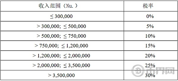 不丹的个人所得税以超额累进税率为基础,税率从0%到30%递增,适用于年收入超过30万努尔特姆的公民、居民以及在不丹有收入的其他个人。2025年《所得税法》将原个人所得税(PIT)和商业所得税(BIT)合并至个人所得税下以简化税收结构。根据新法,具体的个人所得税的各级距税率如下: