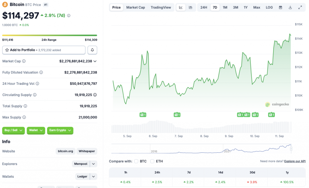 加密货币市场再次出现看涨趋势,比特币(BTC)重新收复 114,000 美元的价格点。据 CoinGecko 称,原始加密货币在过去 24 小时内上涨了 2.5%,上周上涨2.2%,14天图表上涨2.4%。尽管比特币价格有所上涨,但较上月仍下跌3.9%。比特币(BTC)最近的上涨势头,为其即将创下历史新高创造了可能性。