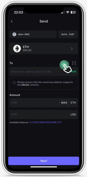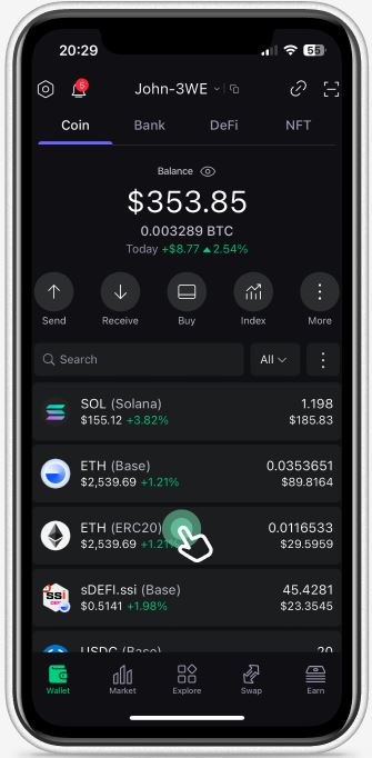 打开您的 SafePal 应用程序,点击您想要存入 Binance 官方应用程序的加密货币,我们将以 $ETH 为例。