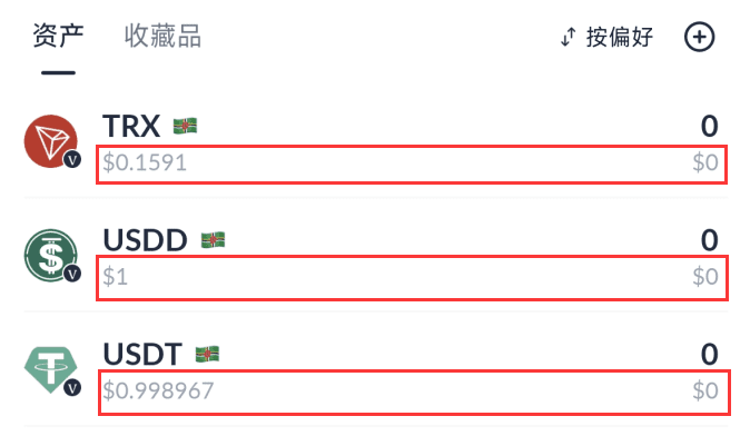 TRX下面的$0.1591,表示TRX当前单价为 0.1591美元/1个,红框后面的$0,表示钱包拥有的TRX资产价值多少美元