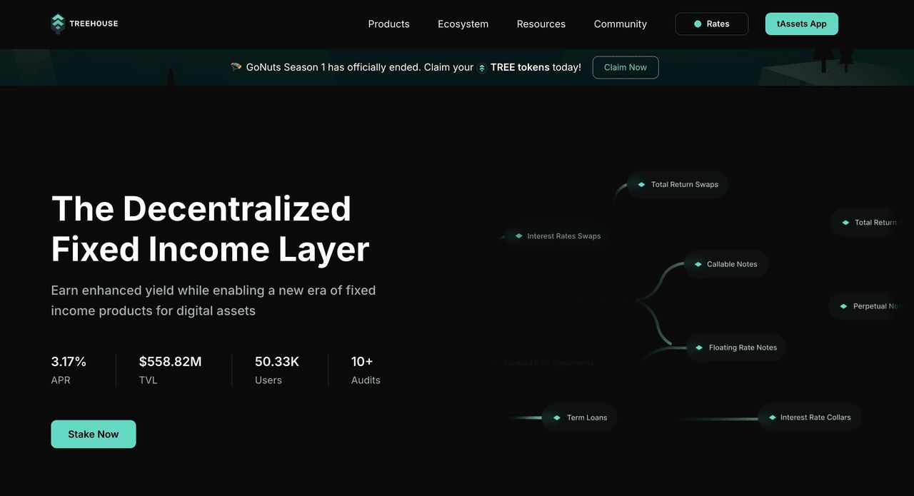Treehouse Finance (Tree)已经从包括Binance Labs、Mirana Ventures 和Lightspeed Venture Partners 等主要投资者那里获得了2,040 万美元的资金,并达成了4 亿美元的估值,这表明机构对固定收益DeFi 领域的强大信心。该协议的TREE 代币于2025 年7 月推出,受到了市场的高度关注,包括与主要交易所的上市整合。 Treehouse 在Ethereum、Arbitrum 和Mantle 网络上运行,旨在通过将标准化的基准利率引入去中心化金融,来应对6 万亿美元的固定收益机会。