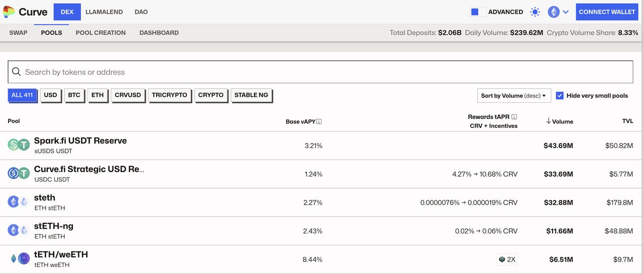 Curve Finance (CRV)于2025 年4 月的总锁仓价值约为15.5 亿美元,稳固了其作为稳定币及类似资产交易领先平台的地位,并具有极低的滑点。该协议已成功扩展到超过12 个不同的区块链网络,同时保持其核心的效率优势,并且其crvUSD 稳定币的流通供应已超过1.2 亿美元,实现了大规模的采用。 Curve 的专注策略使其在DeFi 中捕获了大部分稳定币交易量,其独特的算法使交易者能够以接近1:1 的比率执行大额交换。