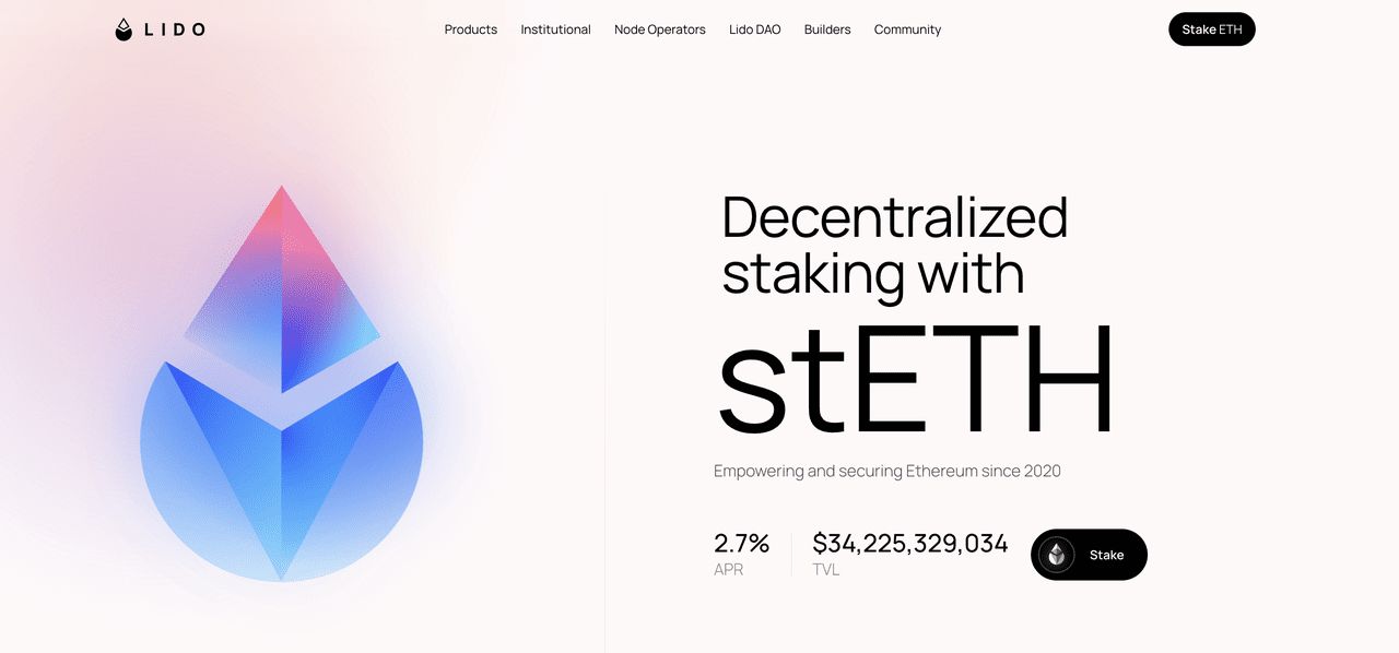 Lido Finance 作为一个流动质押解决方案,允许用户质押任意数量的ETH,而不需要传统的32 ETH 最低要求或管理验证者基础设施的需求。用户会收到stETH 代币,这些代币会自动重新基准化,并反映出质押奖勋,可以像普通ETH 一样在DeFi 应用中使用。该协议雇用了36 个专业节点操作员,以降低质押风险,同时其治理由Lido DAO 管理,并对质押奖勋收取10% 的费用,这部分费用在操作员和DAO国库之间平均分配。