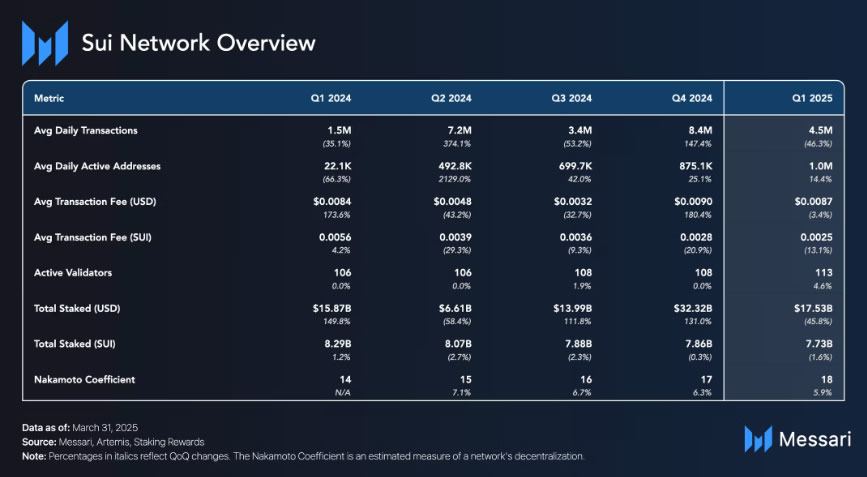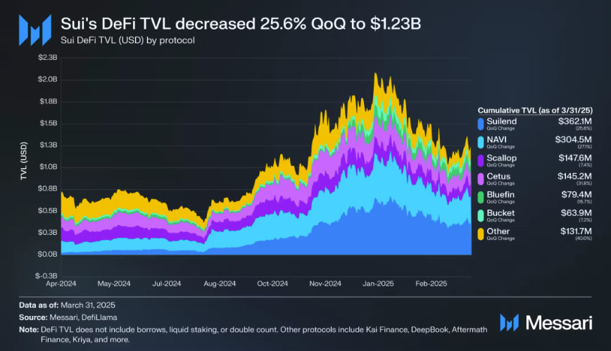 代币经济学结构SUI既雄心勃勃,又充满争议。尽管总供应量上限为 100 亿,但截至 2025 年第一季度,仅有 31.7 亿枚 SUI 代币处于活跃流通状态。同季度,2.42 亿枚 SUI 代币(占总供应量的 2.42%)被解锁,主要分配给私人投资者、团队成员和社区。因此,SUI 的市值在第一季度下降了 40.3%,至 71.9 亿美元,在加密资产中排名第 13 位。该代币的价格从 2024 年第四季度的 4.11 美元跌至 2.27 美元。