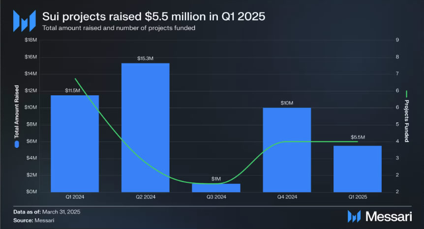 在生态系统融资方面,2025 年第一季度的资本流入较前几个季度有所放缓。根据 Messari 的数据,Sui 上的项目在第一季度共筹集了 550 万美元,分布在四家获得资助的企业中。与 2024 年第四季度筹集的 1000 万美元以及从 2024 年第二季度 1530 万美元的峰值大幅下降相比,风险投资情绪暂时放缓。