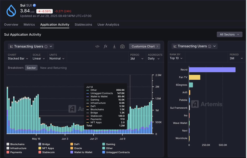 截至 2025 年 7 月,Sui 网络上的活动呈现出显著的“蓬勃发展”态势。Artemis 的数据显示,7 月 14 日,每日活跃地址数超过 120 万。令人惊讶的是,月底我们甚至可以看到地址数增长了近两倍,与前两个月相比呈现了显著的上升趋势。