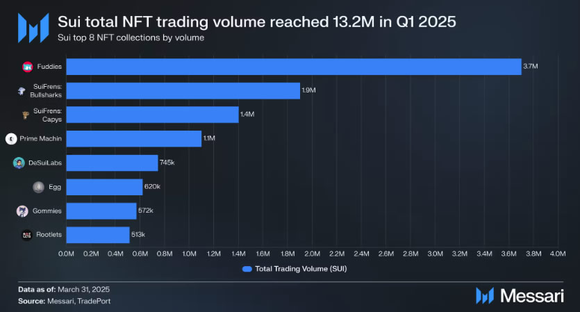 来自 Messari 和 TradePort 的数据表明,NFT 行业显示出“看涨”的迹象。Sui 区块链 2025 年第一季度的交易活动显示,前 8 个集合的总交易量为 1320 万 SUI。