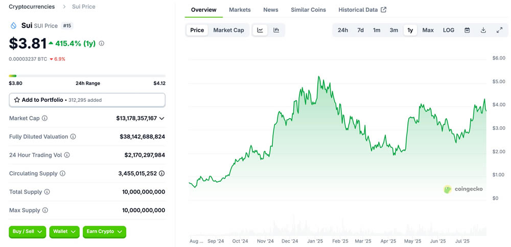 截至 2025 年 7 月,SUI 的交易价格在 3 美元至 4.5 美元之间,偶尔会因网络更新或激励计划而出现飙升。其全年表现好坏参半——在经济低迷时期表现出一定的韧性,但与 Solana 或 AVAlanche 等 Layer 1 领先者相比,表现略逊一筹。