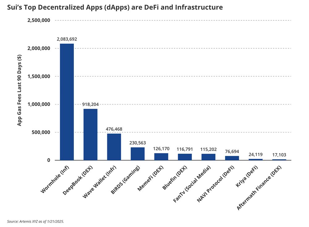 更深入地分析活跃用户数量,近90万笔交易来自各种“其他”活动——可能来自开发者的测试,包括开发机器人、测试协议或实验性dApp。然而,更有意义的是,钱包到钱包的交易量超过8.9万笔,而游戏类dApp贡献了超过1.5万的日活跃用户,这反映出基于Sui的交互式应用的吸引力日益增强。