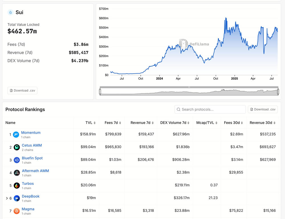 到2025年第一季度,Sui TVL 重回 4.6 亿美元以上,DEX 交易量在 7 天内达到 43 亿美元。仅 Cetus 就凭借 7 天 1.93 亿美元的交易量重夺主导地位,其次是 Bluefin 和 Kriya,这表明人们对网络上的去中心化交易所的信任度有所提升。