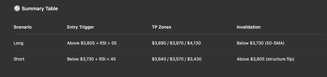 提示:“为ETH/usdt今天生成多空情境。使用4小时结构,相对强弱指标(RSI),移动平均收敛背离指标(MACD),以及当前成交量的情境。包括进场触发、无效化条件,和止盈区域。”