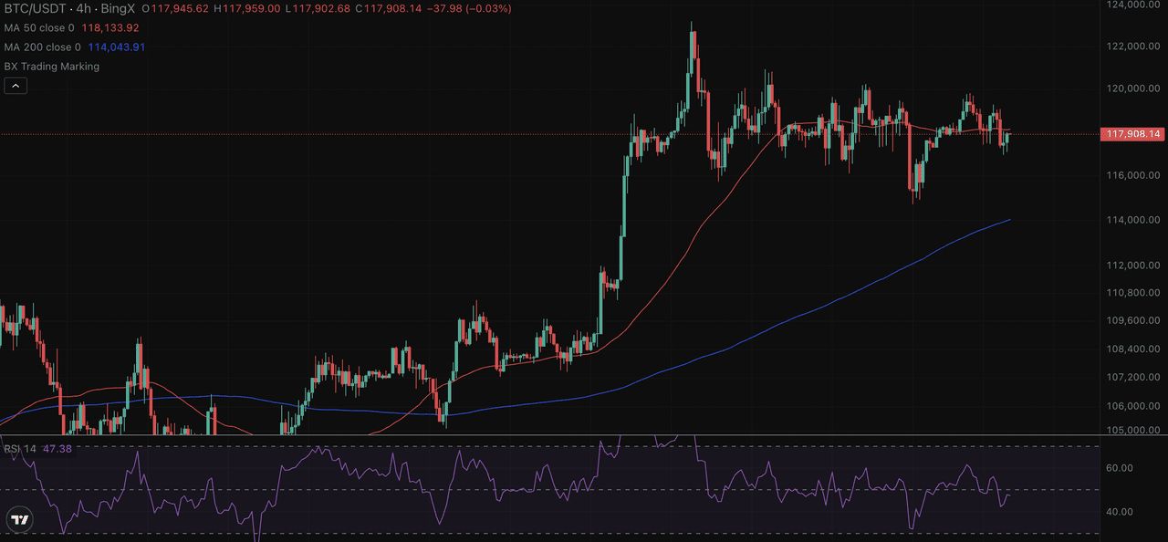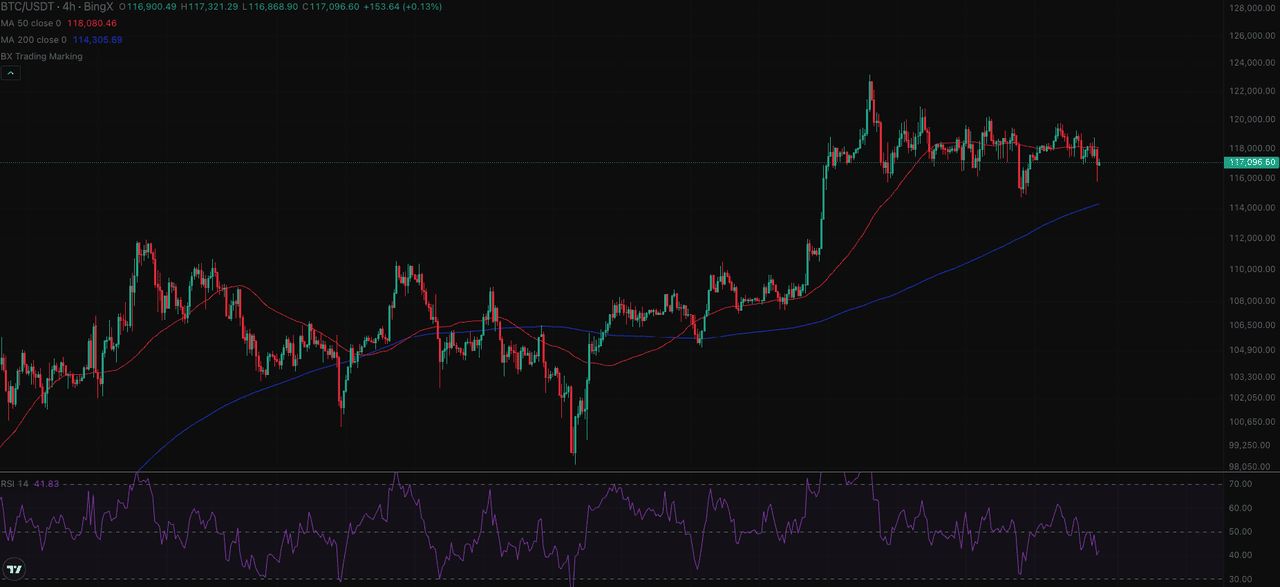 BTC 在多次突破尝试后未能守住$117,800–$118,000 的阻力带。价格目前在50-SMA 下方交易,RSI 约41,显示出经典的买方疲劳迹象。