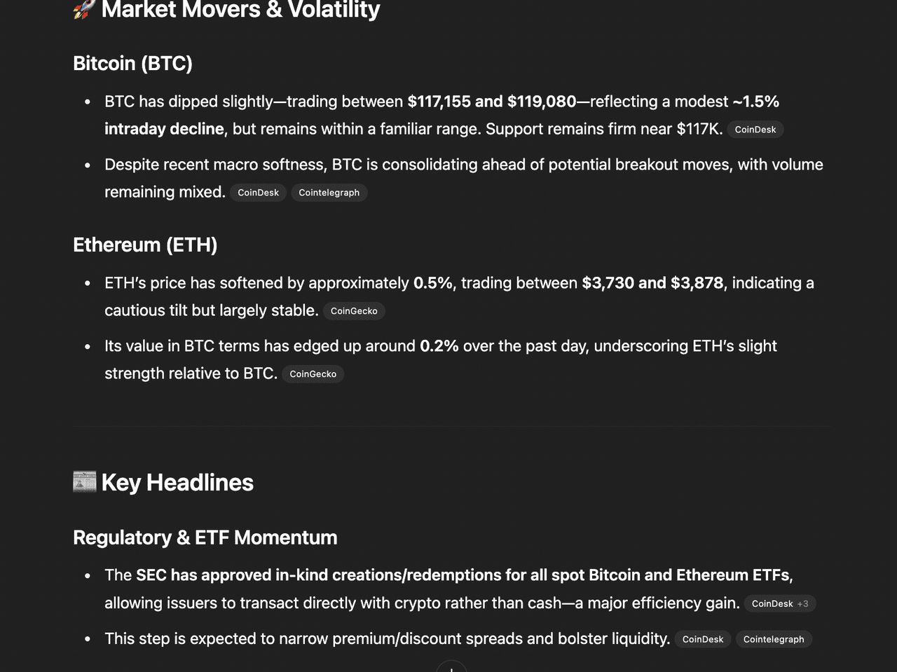 1. 「总结隔夜的波动性和主要加密货币新闻。」