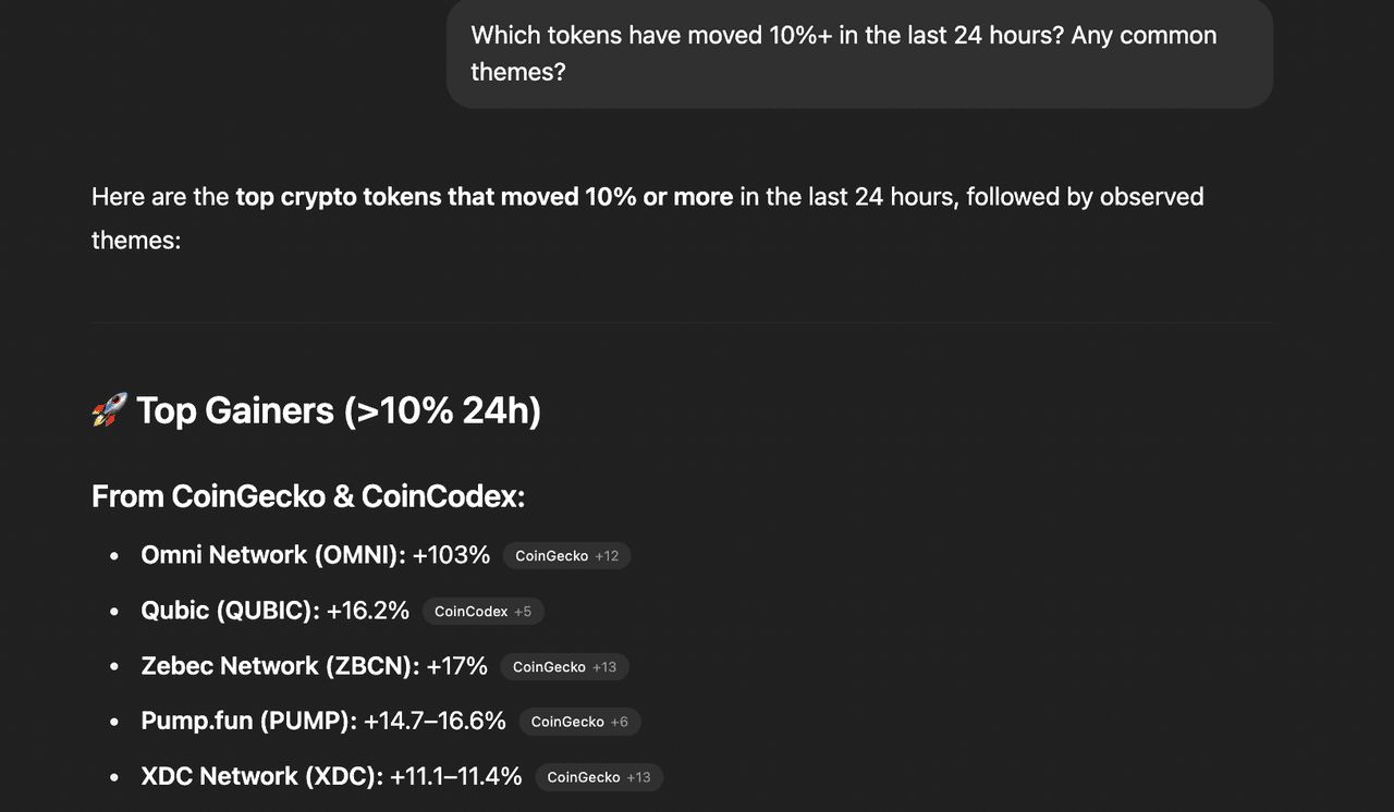 提示:“哪些代币在过去24 小时内波动超过10%?有没有共同的主题?” ChatGPT 可以帮助你识别动量交易、行业轮动或市场情绪的突变。