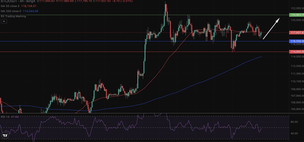 • 结构: BTC 正在50 期移动平均线($118,133) 下方整合,支撑位于$116,000 附近,阻力位于$119,000 附近
