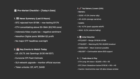 使用ChatGPT 进行市场前准备:总结过夜的波动情况,列出关键事件,扫描涨幅/跌幅榜,并生成带有风险参数的交易场景。