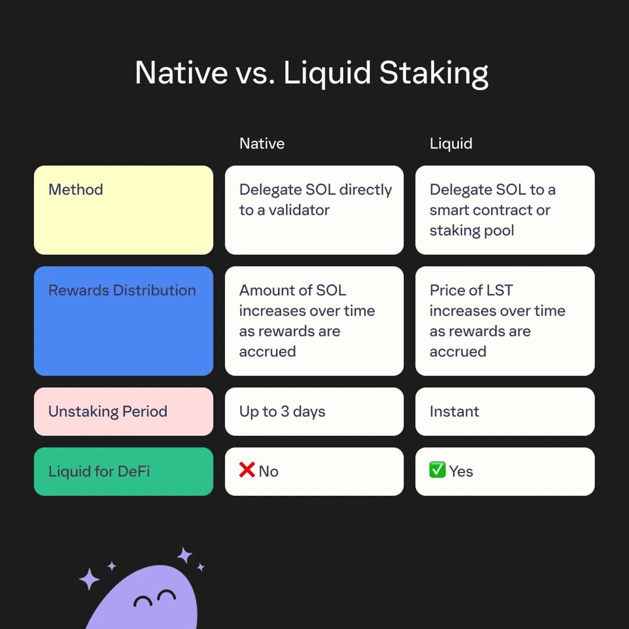 | 流动性(Liquidity) | 锁定 | 锁定或延迟 | 可通过流动性质押代币(LSTs)使用 |
