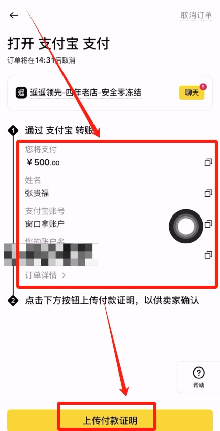 8、然后你去根据商家提供的支付方式给对方转钱,转完钱之后把你的付款记录进行截图,然后在这里上传付款证明就好了。等待卖家核实收到钱之后就会把币打给我们了。