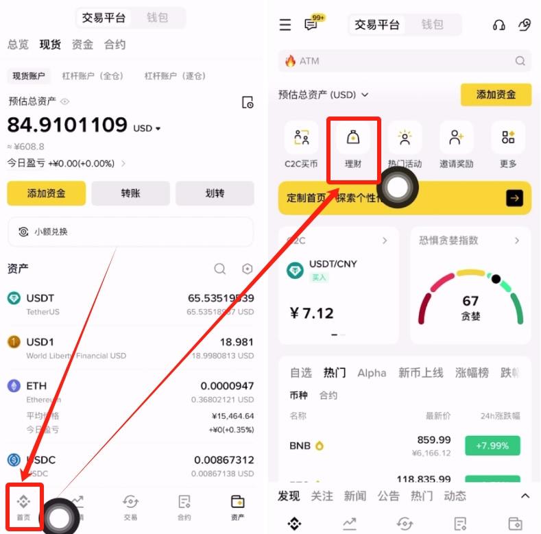 5、买好USD1之后我们就可以去参与理财了,点击币安的首页,再点击这里的【理财】。