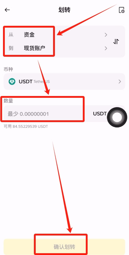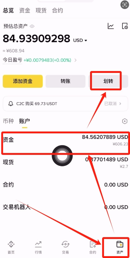 9、我们买好的USDT都在资金账户里面,我们点击右下角的【资产】,你可以看到我们的资金是在资金账户里的,我们需要进行划转。
