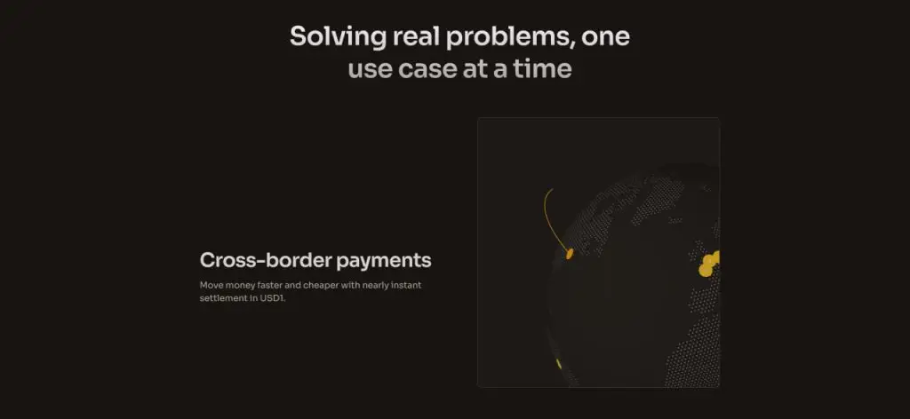 - USD1 允许用户在几秒钟内进行国际汇款和收款,无需通过中介银行或传统的 SWIFT 系统。
