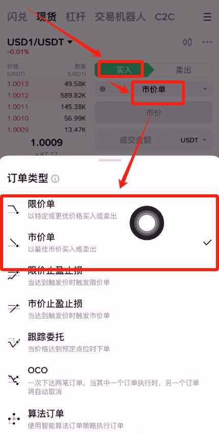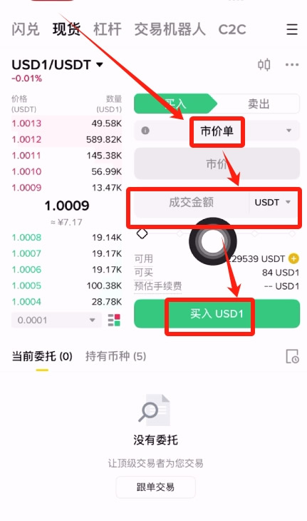 3、如果你不想等,可以选择市价单。“市价单”就是他会以当前市场最优惠的价格直接成交。我们在这里直接输入要购买的金额就可以购买成功。点击【买入USD1】直接就下单成功了。