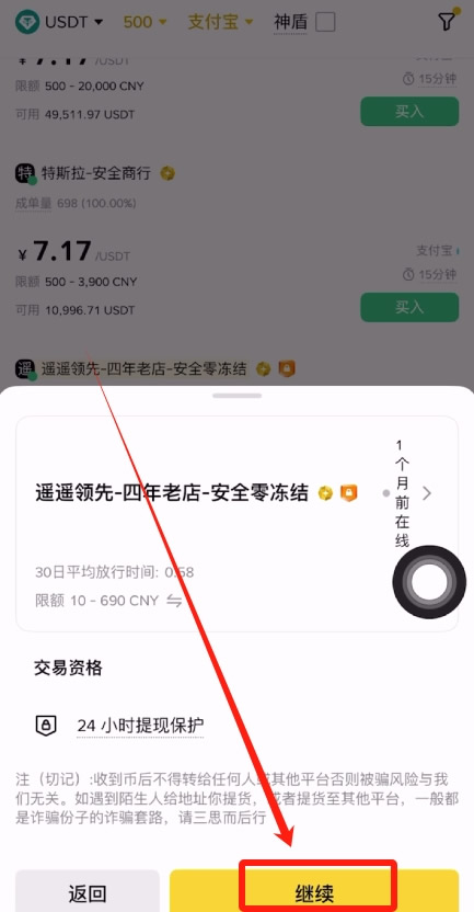 5、币安平台就会为我们筛选出符合要求的商家了,我们要找成单量和成交率高的商家来进行购买。