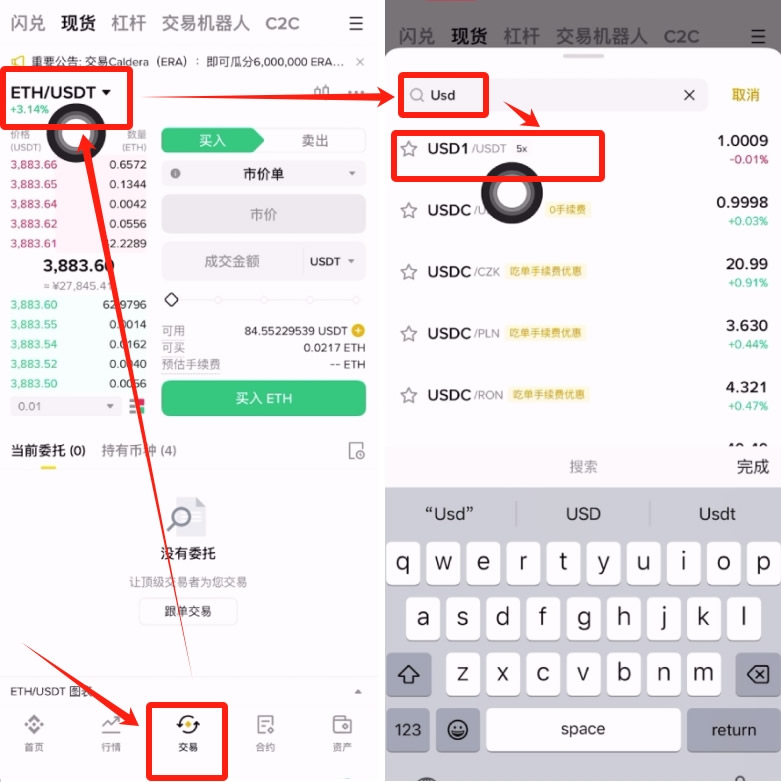 1、划转好之后点击下方中间的【交易】按钮,在在这里去搜索USD1这个币,选择第一个USD1/USDT,就是我们使用USDT去兑换USD1。