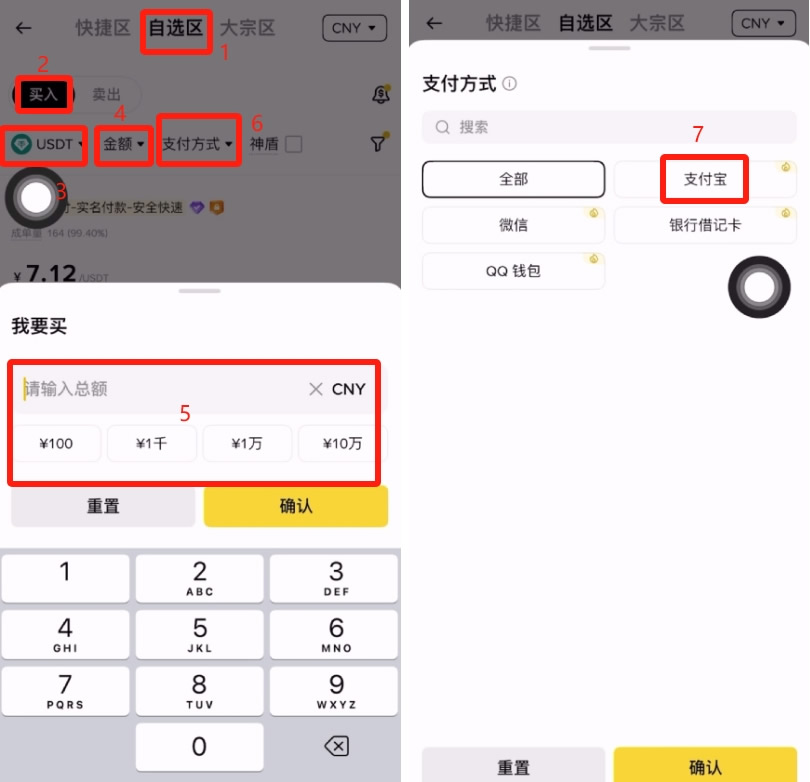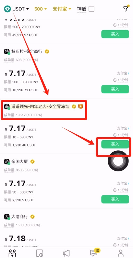 3、然后我们使用自选区,就是个人对个人交易。选择【买入】,要买的币种是USDT。USDT就类似于美元,我们购买其他的币种都要用到USDT。