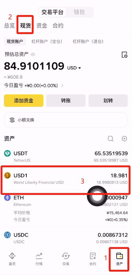 4、我们回到资产的页面,在现货账户就可以按到我们购买好的USD1了。