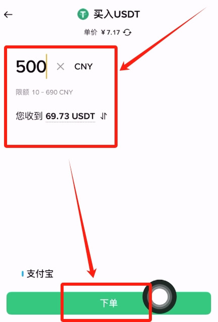7、再次输入一下我们要购买的金额,它会自动为我们算出来支付500人民币将收到69.73颗USDT。点击下方的【下单】。