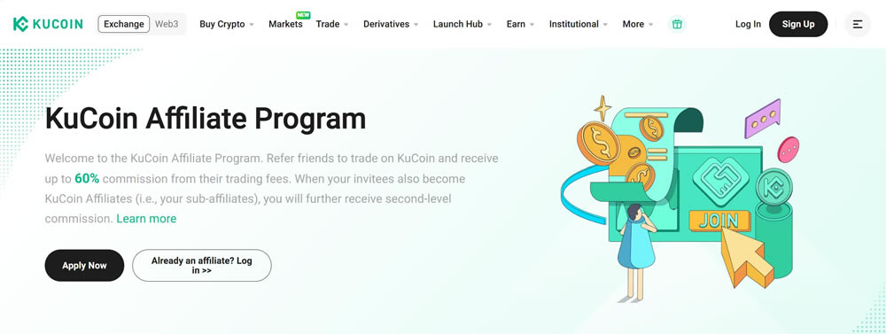 KuCoin是一家全球知名的加密货币交易所,数据显示 25% 的加密货币持有者使用该平台。该交易所运营着一个加密货币联盟计划,最高可获得交易费 60% 的佣金,用户还可以推荐子联盟会员赚取更高的佣金。要成为联盟会员,任何人都必须证明自己拥有受众群体并有能力有效推广平台。获得批准后,您将获得一个自定义链接,您可以在社交媒体渠道或网站上分享。如果您推荐的用户少于 5 人,或他们在三个月内交易的比特币数量少于 5 个,佣金最低为 40%,但如果您推荐的用户数量达到 100 人,且交易量达到 200 个比特币,佣金最高可达 60%。