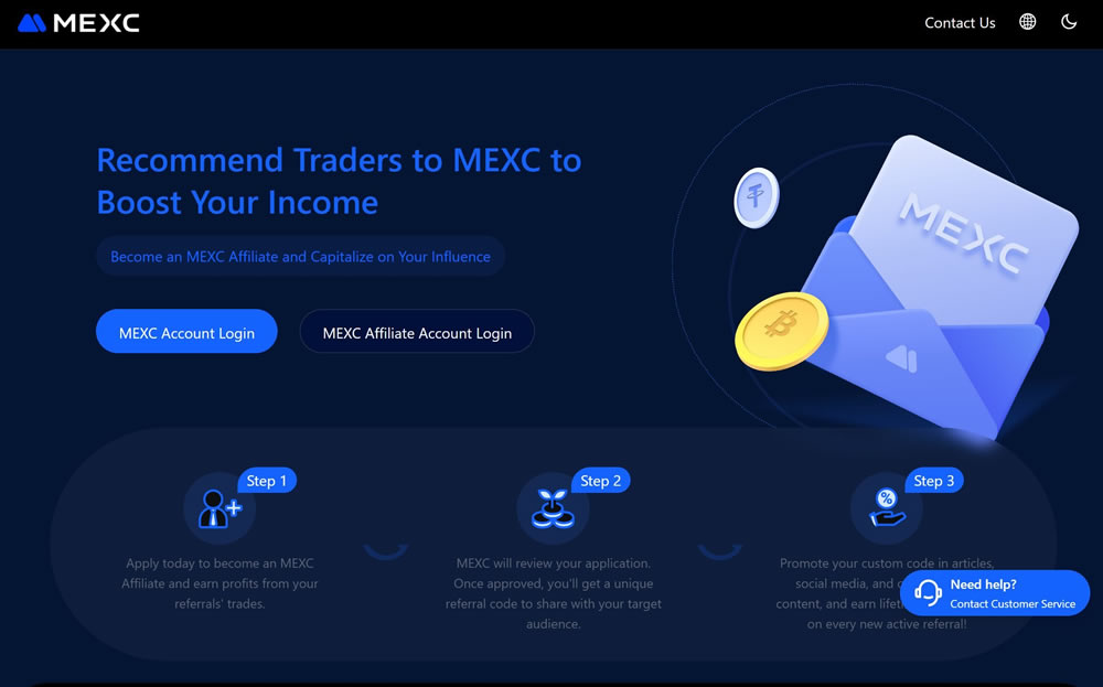 MEXC是知名的一线数字资产平台,拥有数百万活跃用户,遍布全球。该平台支持超过 2,000 个现货交易市场,交易量位居全球前列。MEXC 也是大多数新发行的小市值山寨币的首选平台。MECX 提供衍生品和永续合约交易选项,杠杆高达 200 倍。这吸引了众多有意赚取额外收入的加密货币联盟 会员。要参与 MEXC 推荐计划,您需要持有至少 2,000 枚 MX 代币( MEXC 原生代币)。您还需要五位已完成交易的认证推荐人;或者,您可以赢取 20,000 枚 MX 代币。