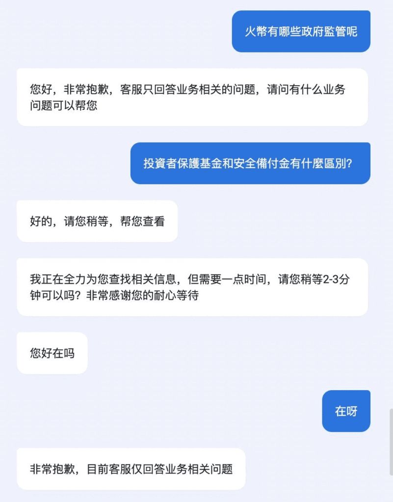 HTX 的在线客服专业度不太行,「背后的」专员似乎也一般,回应速度倒还算快,解答效率就和我理想的有一些差距了。