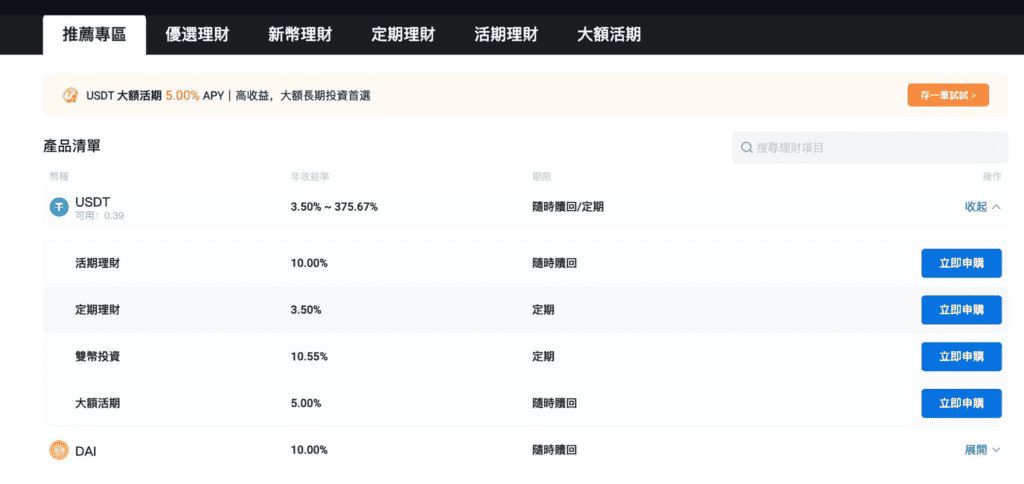 - 加密货币贷款:用户可以抵押BTC、ETH或USDT等资产来借入其他加密货币,动态利率、高LTV比率且无贷款限额。