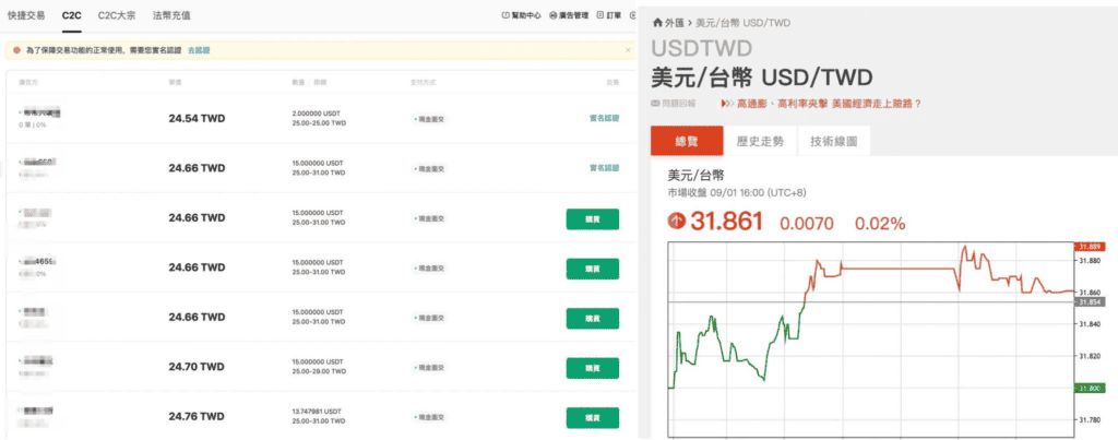 | C2C | 平台不收手续费,但会有区块链转账费用和兑换的价差 | 不同的商家台币兑换虚拟货币的汇率不同 当下兑换比率:1 USDT = 24.66 ~ 38.00 TWD |
