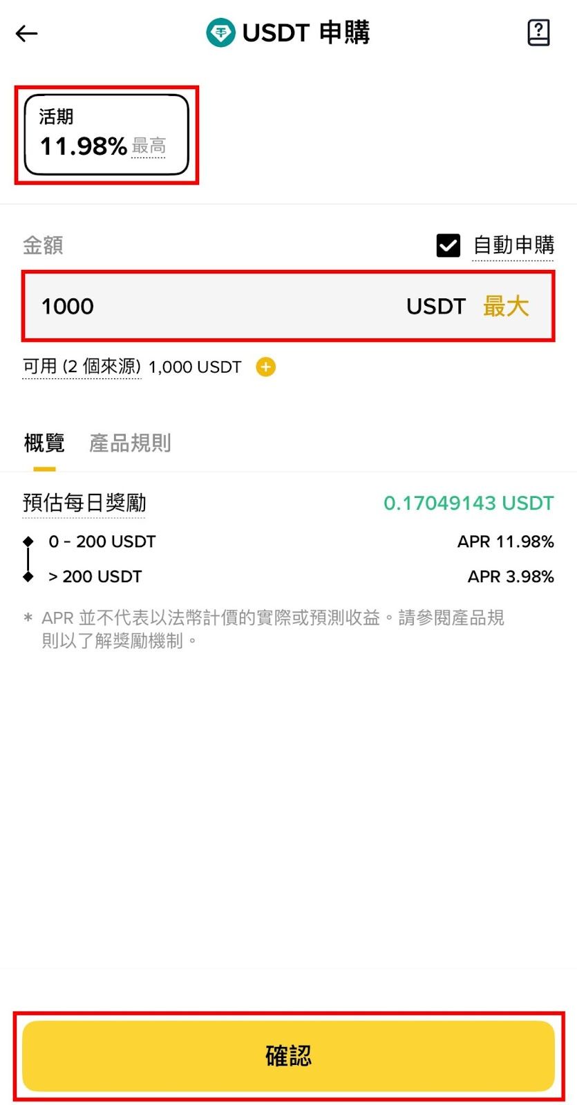点选后,可以看到上方有活期选择,中间为要投入的USDT 数量,选择完毕点击下方确认,这样就完成申购了。
