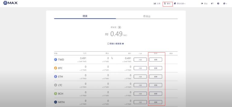step 1:登入MAX 交易所首页后,点击右上方的「钱包」。下滑页面,在数位资产列表找到您欲提领的虚拟货币币种,点击「提领」。