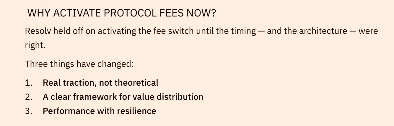 在关于打开“费用开关”的官方公告中,Resolv 提到“目前时机和架构均已成熟” —— 协议已实现了现实的、非理论的牵引力;协议已有了清晰的价值分配框架;协议已表现出了韧性 —— 因此决定不再推迟“费用开关”的启动。